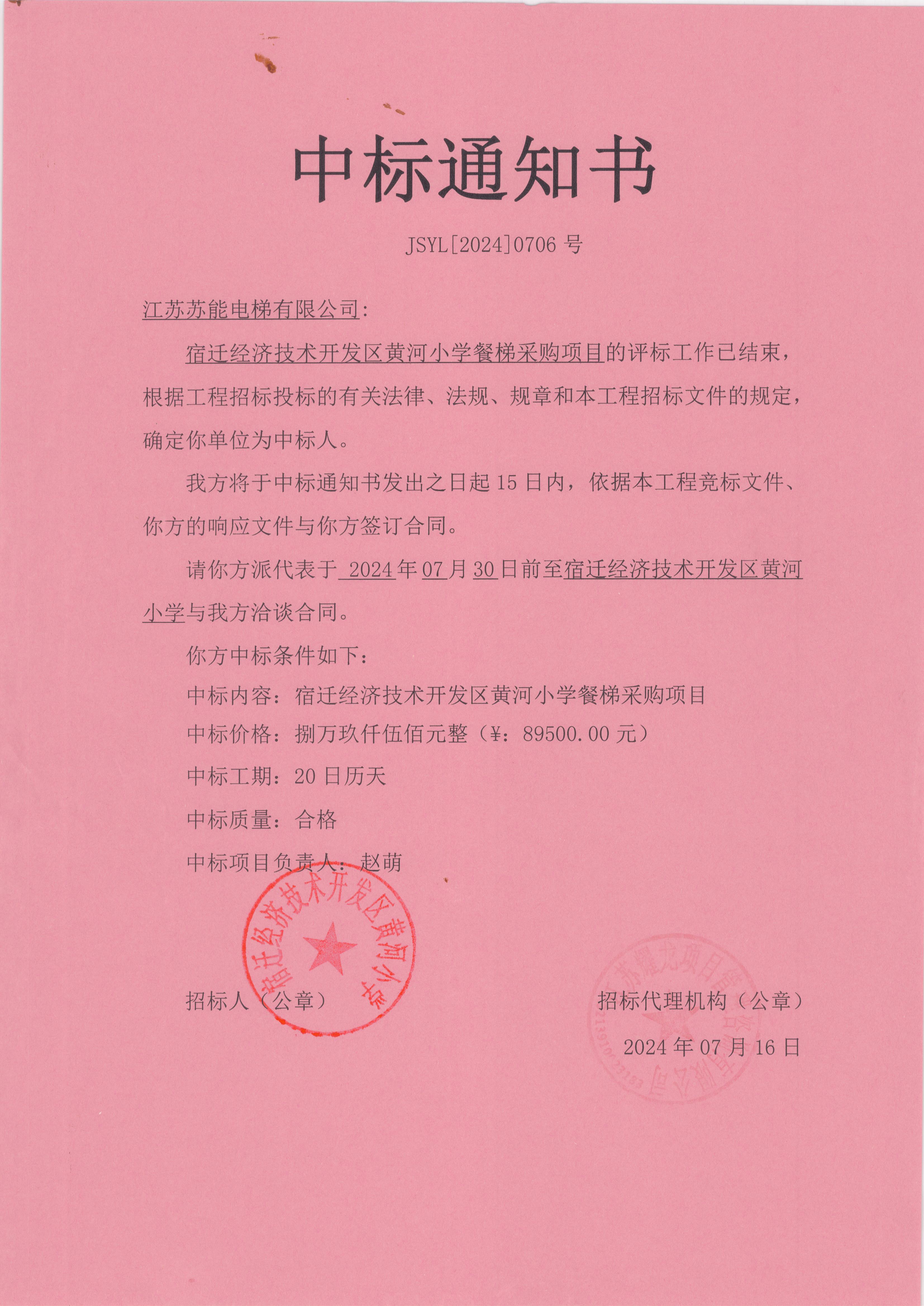 热烈祝贺我司中标宿迁经济技术开发区黄河小学餐梯采购项目